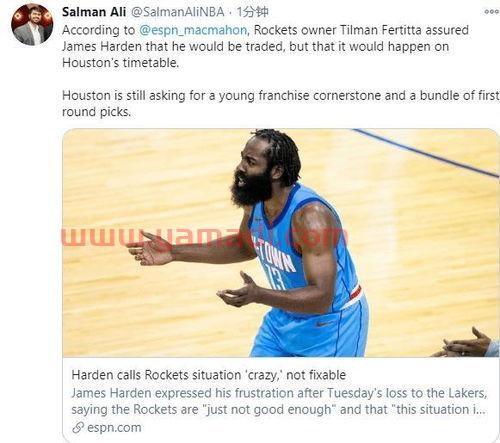 3、火箭关于哈登交易的要价是:1个年轻的建队基石类型的球员,多个首轮签+新秀期天赋型球员。