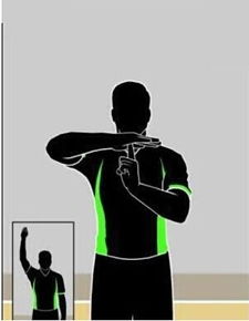 裁判手势:右手掌心摊开横放于胸前,左手抵住右手掌心,成T形手掌示之。